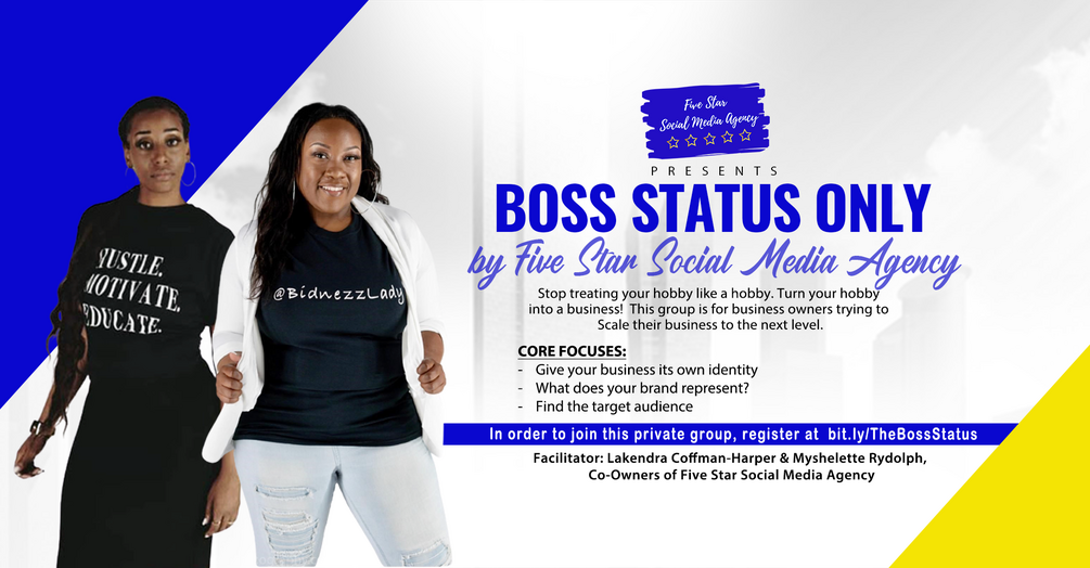 Are you looking to turn your hobby into a business? Do you have a business that's waiting to level up? What's standing in between you and becoming a self-made BOSS? The Five Star Social Media Agency specializes in educating businesses on how to brand themselves. Here you will be given insight that will scale your business to the next level.